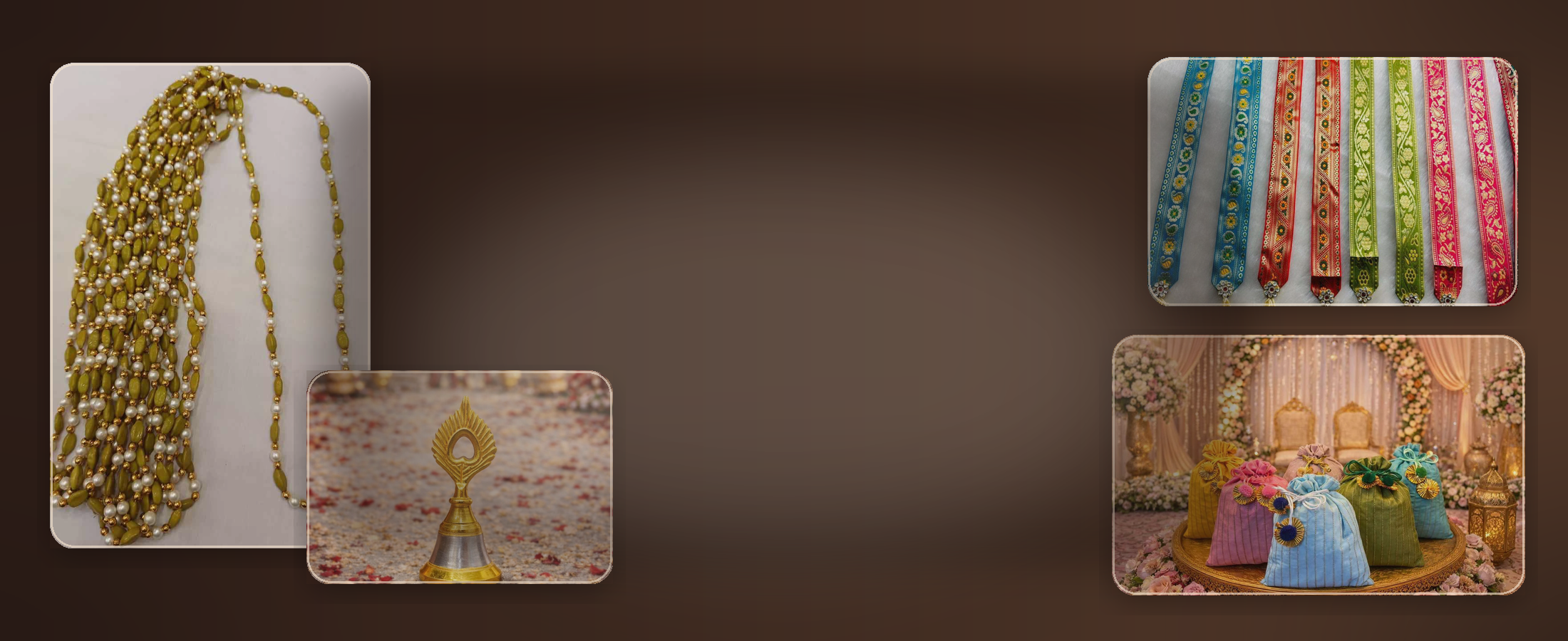 We are trusted by families, event planners, retailers and wholesalers across India for our quality, timely delivery and custom order support. Shop premium wedding accessories crafted with care and delivered with love — PAN India.